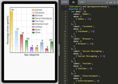 Another type of bar chart is the kind with segments in the bars. It can display data in multiple dimensions. And, just like the previous components, dragging-and-dropping this component onto the design screen will generate a section of JS code; manually enter JSON data and you are done! (However, the JSON data will contain a matrix; after all, this is a "segmented" bar chart.)